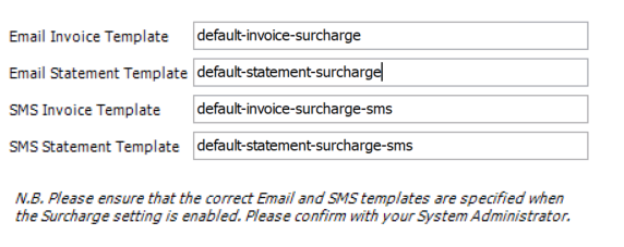 To use custom templates in MediBooks go to Settings -> Surcharge. Then enter the template information into the boxes as provided by CityPay. If left blank the default CityPay template will be used instead.