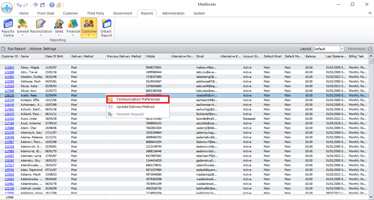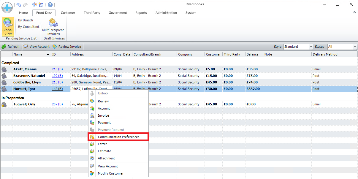 The communications dialog can be accessed from two different places in MediBooks, the Front Desk and the Customer Details report.
