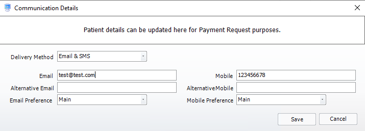 From within the Communication Details dialog you can change the delivery method used by the customer. In addition, sending payment requests from places such as the Front Desk or customer accounts will provide an opportunity to update the customer payment request information. Once you have made the desired changes, click Save to save and close the dialog.