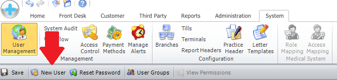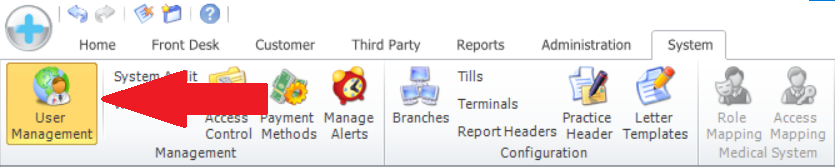 Open MediBooks and select the System Tab. Then, open the User Management tab.