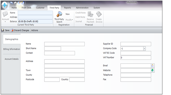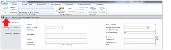 Open MediBooks and select the Third Party Tab. Click on [New]. Fill in the Third Party Details in the boxes provided. Once you are satisfied with the information provided, click [Save].
