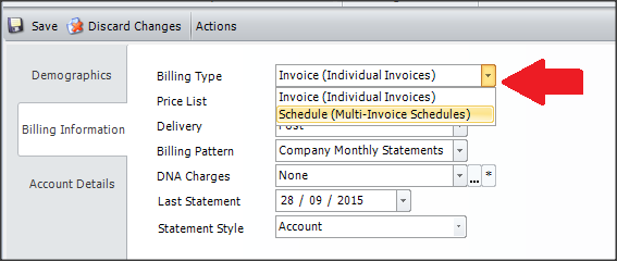 On the [Billing Information] Tab, select Schedule Invoices from the drop down, along with the chosen Price List.