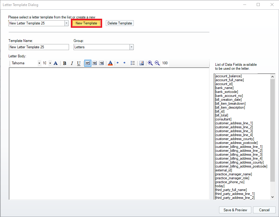 Edit the template content as required. The Data Fields on the right-hand side of the screen will fill automatically with the content displayed inside the square brackets when added to the letter. To add them to the template either type the full name as it is written or select the data field you wish to use and press CTRL+C to copy and then paste the content with CTRL+V into the desired location.