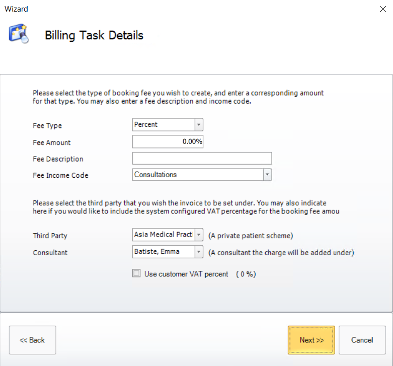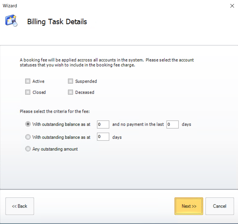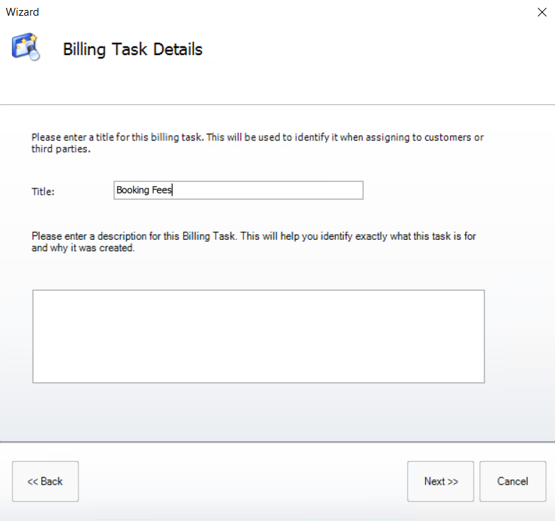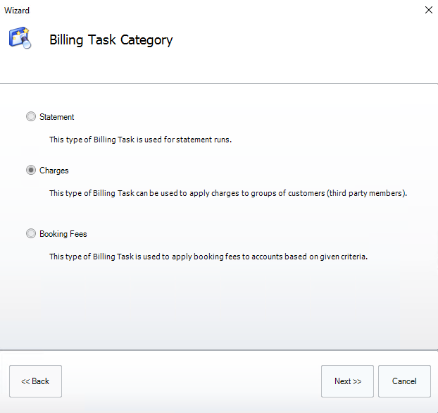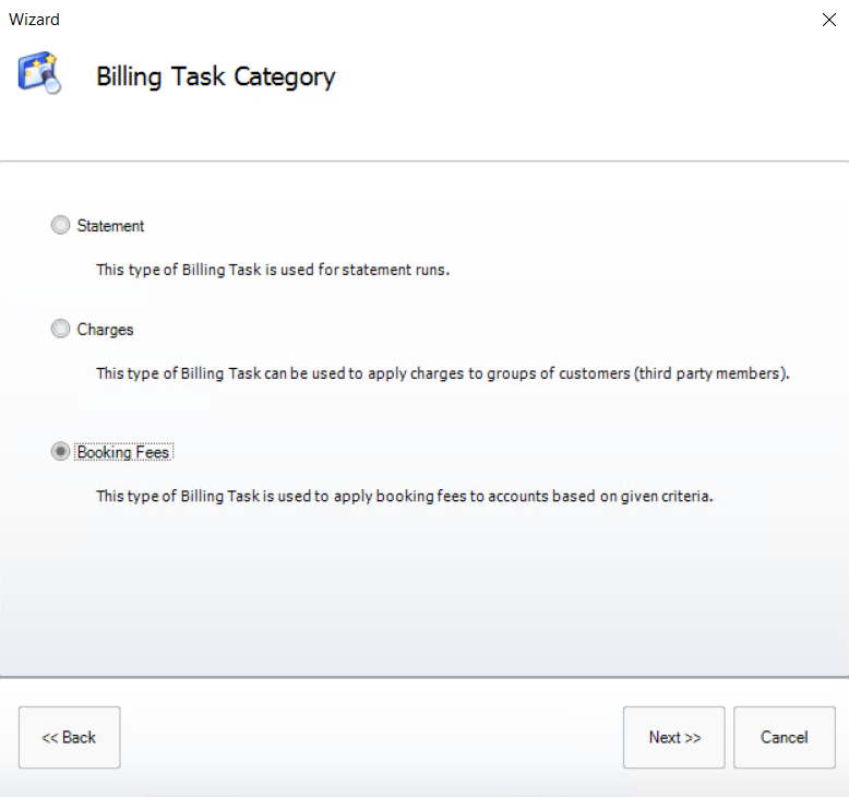 To create a booking fee task open the Billing Task Wizard and select [Booking Fees]. Then click [Next].