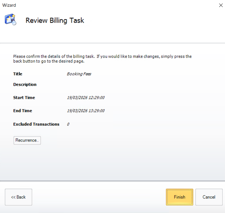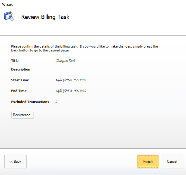 This will open a final page where you can review the billing task. If it is correct use [Finish] to create the task.