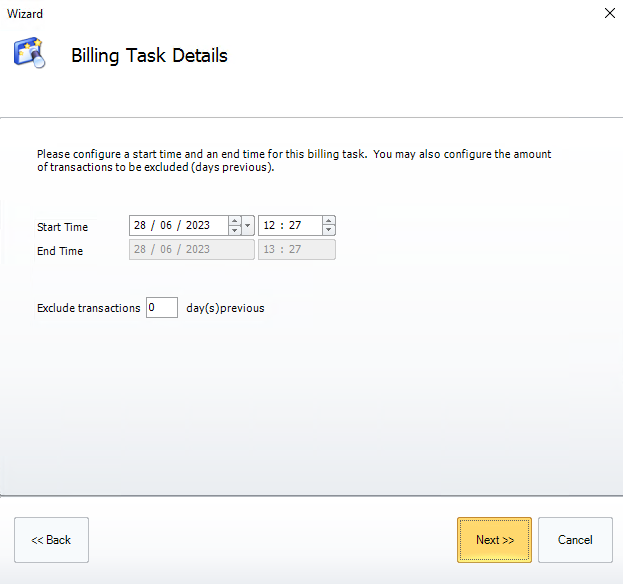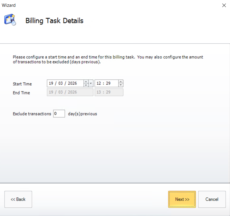 On the next page set the number of previous days that will be excluded, for example, if a customer has an unpaid debt that is 5 days old and the exclusion is set to 10 days the debt will not be counted when the task is run.