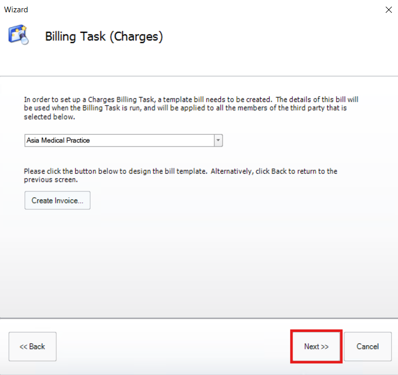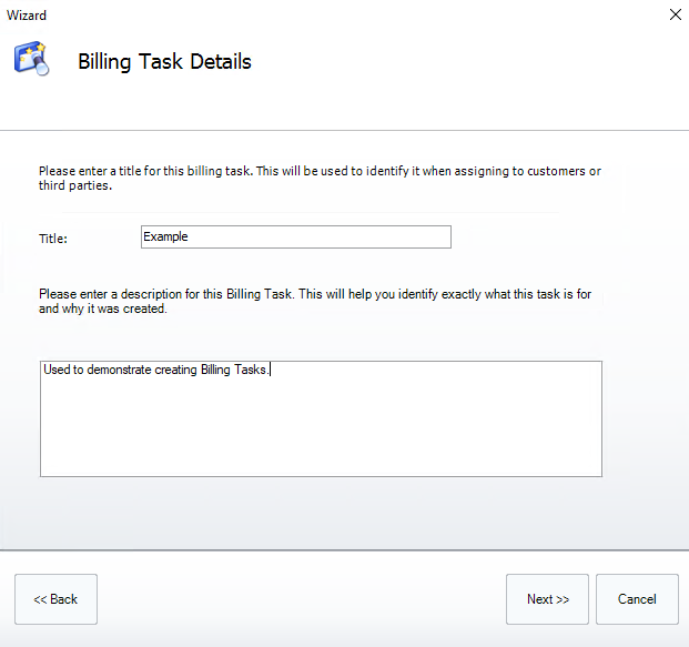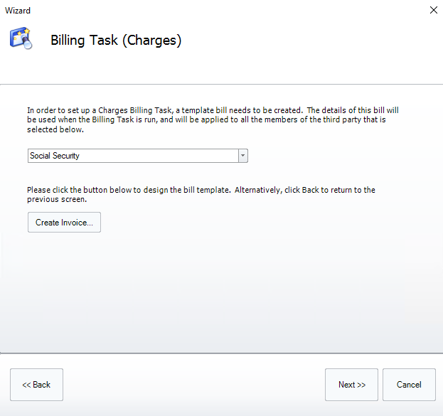 The next page provides options for which type of billing task should be created. These are: