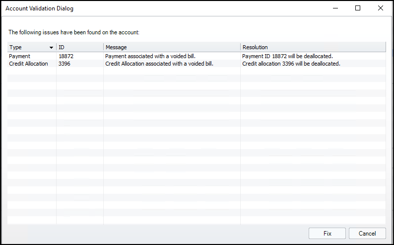 Or from version 7.34 a dialog will display any issues along with the action that will be taken to resolve them. Click Fix to resolve the issues.