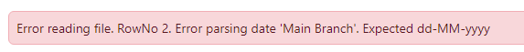 - "Error parsing date 'Main Branch'. Expected dd-MM-yyyy", means it was expecting a date but found 'Main Branch'.