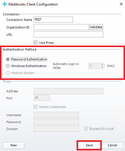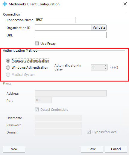 In MediBooks there are multiple different ways a user can log in, settings that can be used to view or change the current login method can be found on the "MediBooks Client Configuration" window, inside the section labeled "Authentication Method". What the authentication method settings are set to will be specific to each computer.