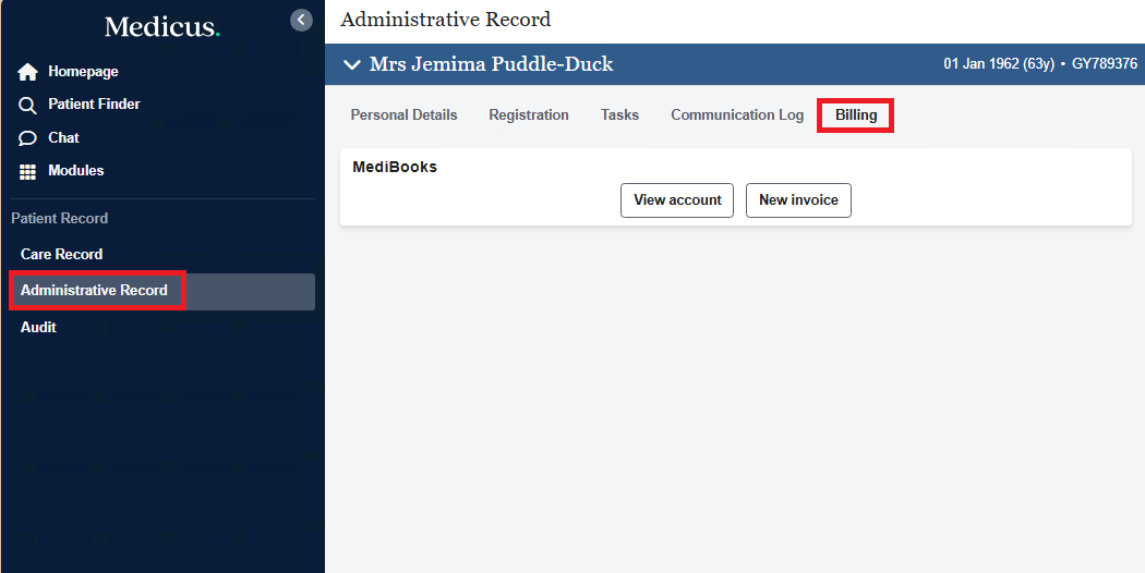 To sync MediBooks with Medicus, select the patient you would like to sync and select "Administrative