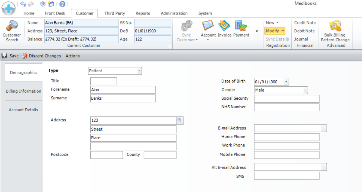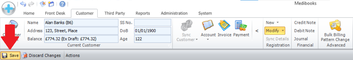 Customers that have been created within MediBooks can have their details edited, if the customer has been imported from the medical system their details will be locked and cannot be changed from MediBooks.