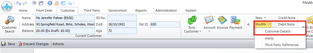 Go to the Customer Tab within MediBooks. Search for the Customer/Business required (Details of how to search are available in Searching) Select the Customer you wish to edit by clicking on the Customer. Under Modify click [Customer Details]. On the ...