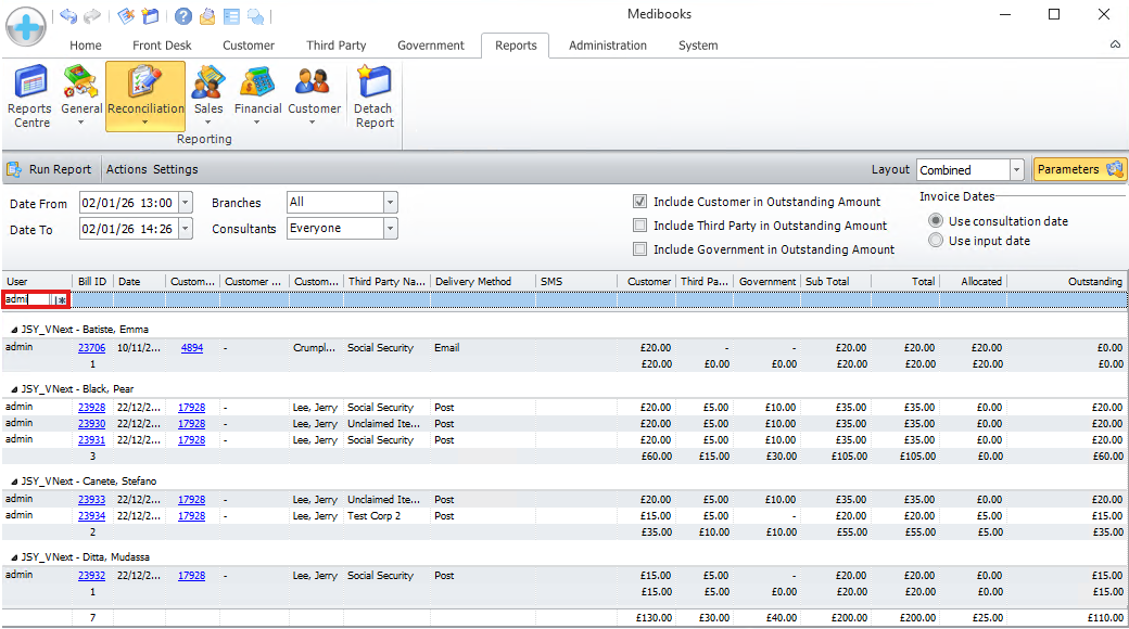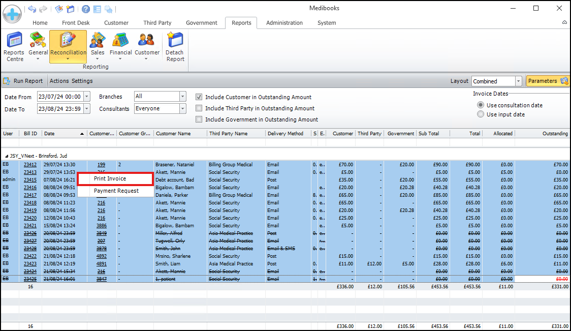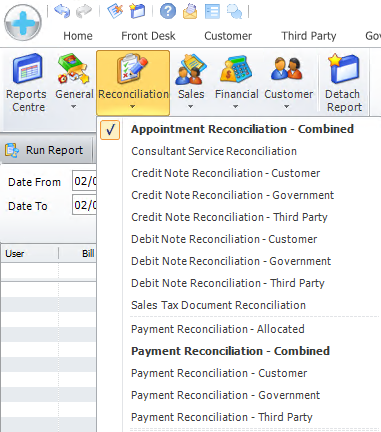If while printing invoices from the Front Desk, MediBooks crashes before the invoices can be printed, the Appointment Reconciliation report can be used to find the invoices and print them.