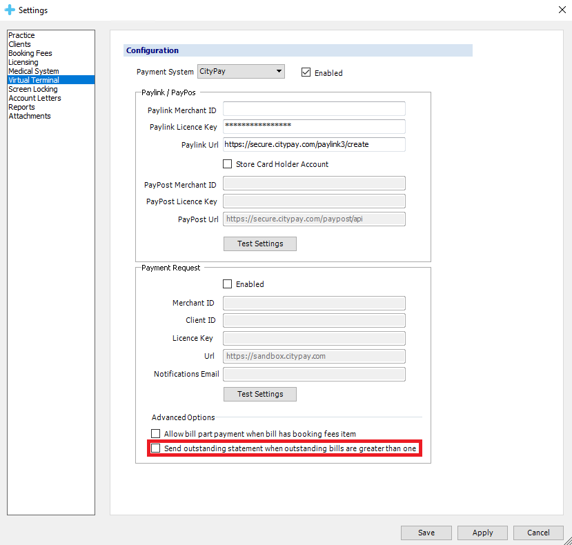 Normally, when sending payment requests on an invoice MediBooks will always send a payment request for just the invoice. However, MediBooks provides the option to configure the Bill Payment Service so that whenever a payment request is sent on an account with more than one outstanding invoice, a statement with all outstanding charges is sent instead.
