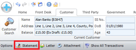 The Statement button on the account overview page and the Payment Request button shown on the Customer Details report can be used to send a statement to a customer.