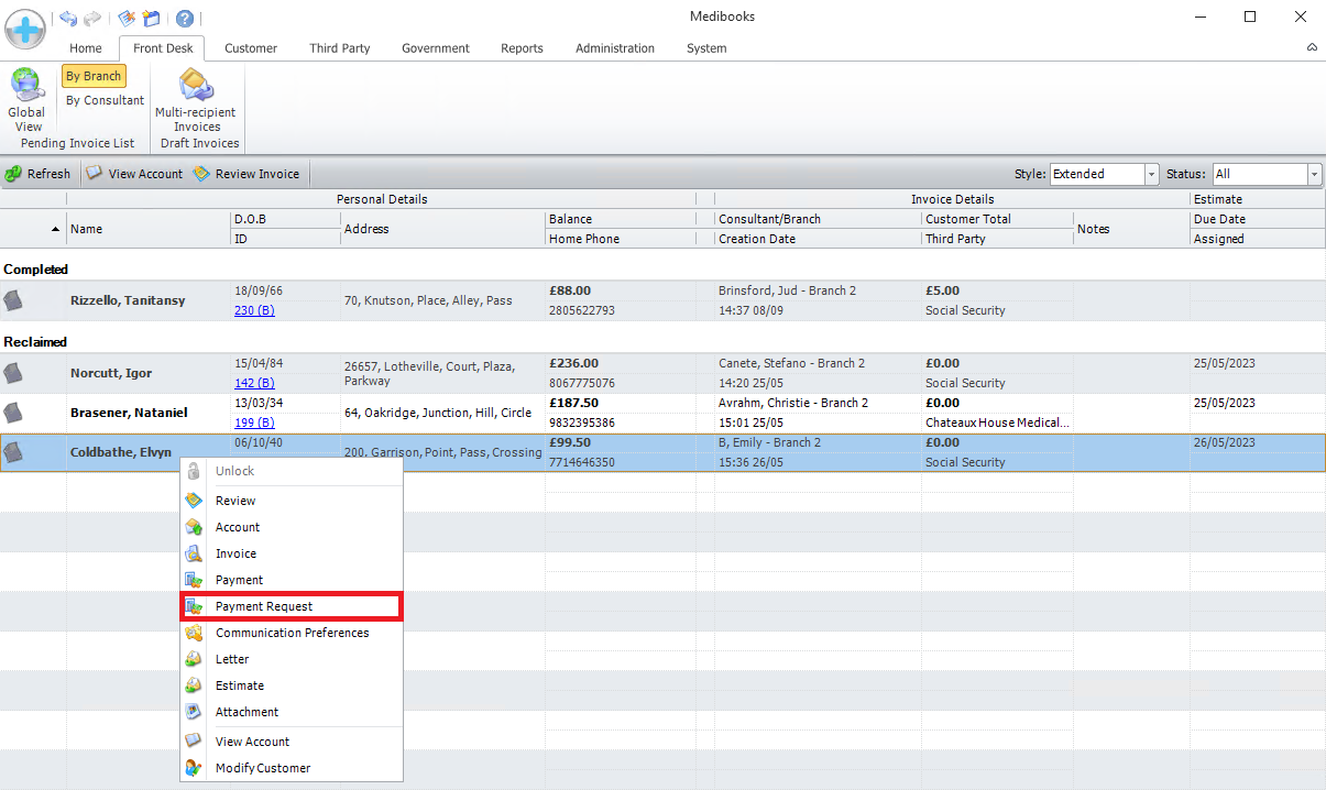 Next, right-click on a customer with an outstanding balance that you want to send an invoice to and select Payment Request.