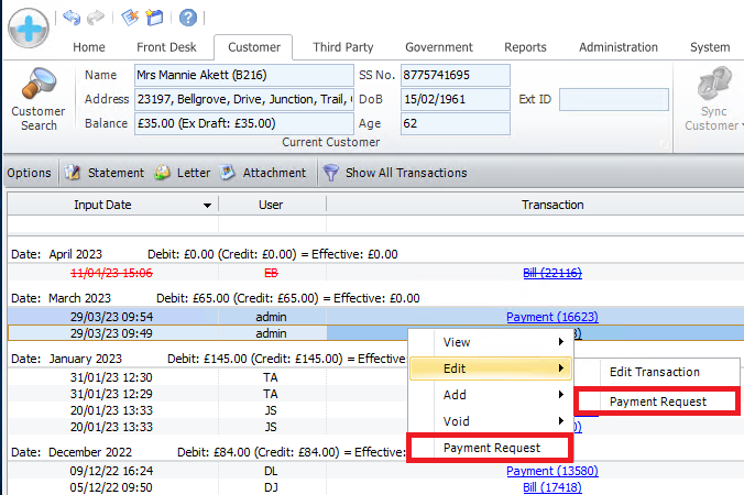 - Right-clicking on an invoice on the customer account screen shows Payment Request buttons which can also be used to send payment requests.