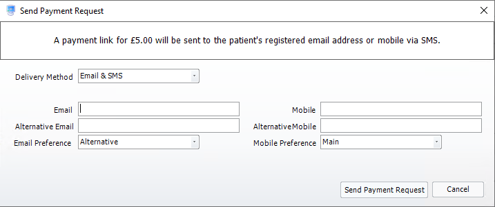 When sending payment requests from any location except the Statement Delivery page, MediBooks will provide the option to modify the customer's delivery method and contact details.