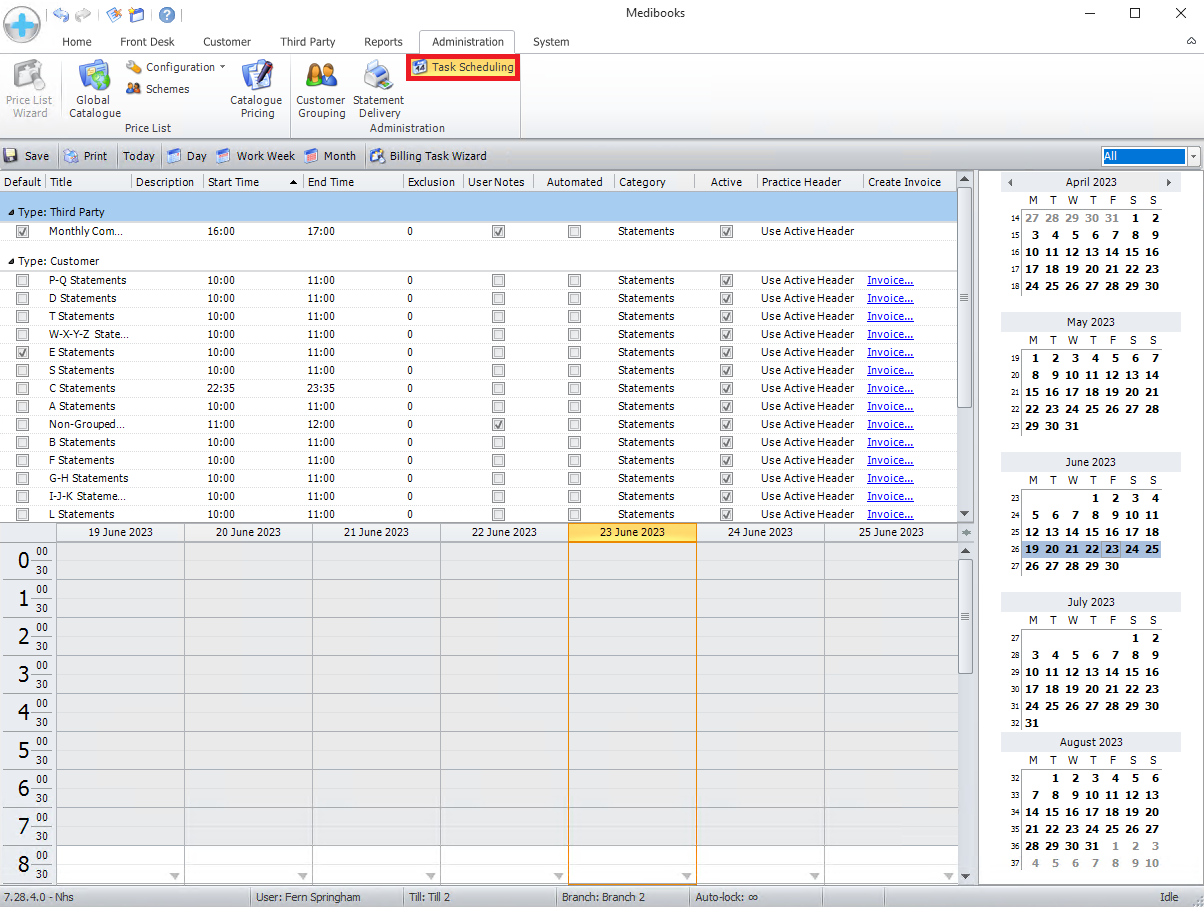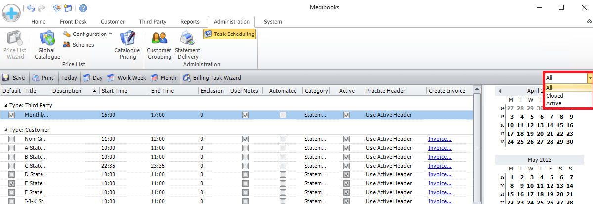 The Task Scheduling page in MediBooks can be used for actions relating to tasks which are used to bulk-create statements or apply charges or booking fees to customer accounts. To learn how to create a task please read: Creating Tasks.