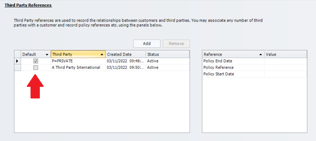 Ensure the correct customer has been selected and open the Third Party References page, select a default Third Party by Clicking on the tick boxes on the left side of the list.