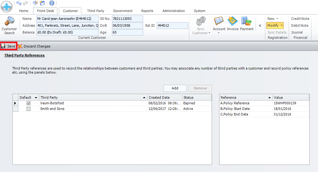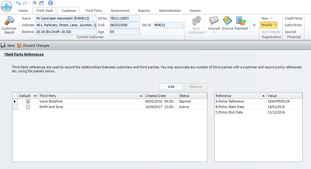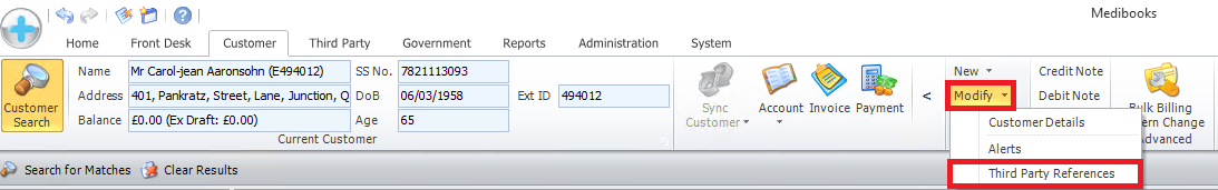 Search for the Customer/Business required (Details of how to search are available in Searching). Select the Customer you wish to Link by Clicking on the Customer. In the Menu bar, select [Modify], then [Third Party References].