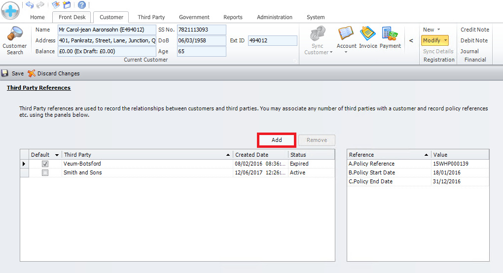 Ensure the correct customer has been selected and open the Third Party References page, to add a Third Party Reference, Click [Add].