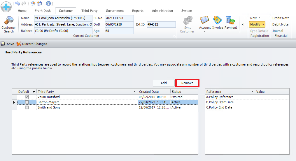 Ensure the correct customer has been selected and open the Third Party References page. Select the third party you would like to remove and click [Remove].