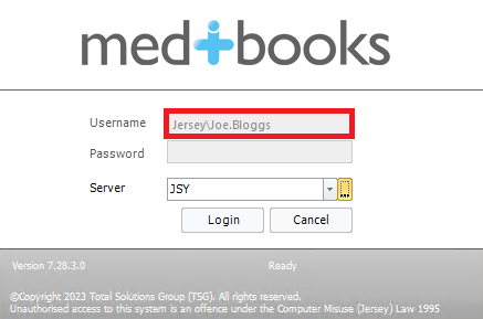 The first step to setting up an account for use with WindowsLogon is to find out the Windows Login Credentials of the account that needs to be enabled, an example of this is: "Jersey\Joe.Bloggs". This can be done by setting WindowsLogon as the authentication method and opening the login screen for MediBooks using the Windows account you want to use. Then from the username field write down the text shown, being careful to include which letters are capitalized.