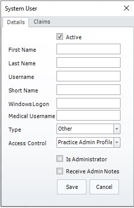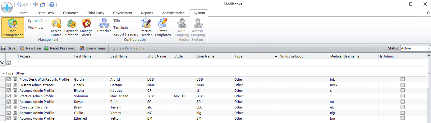 Change the authentication method back and log in to MediBooks. Navigate to the "User Management" page, this can be found under the "System" tab. Double-click on the row containing the desired account.