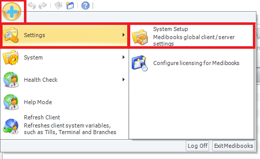 When setting a customer's third-party references it is possible to set a policy start and end date. Using the "System Setup" settings in MediBooks what happens once this end date is set can be controlled. To open the settings select the blue plus in the top left corner, then "Settings" and then "System Setup". These three buttons are highlighted in the image below.